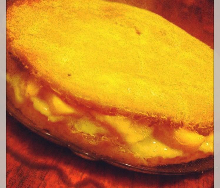 2. Once the syrup soaked konafa has cooled down to room temperature top one of the konafa discs with the mango cream and the chunks of mango.