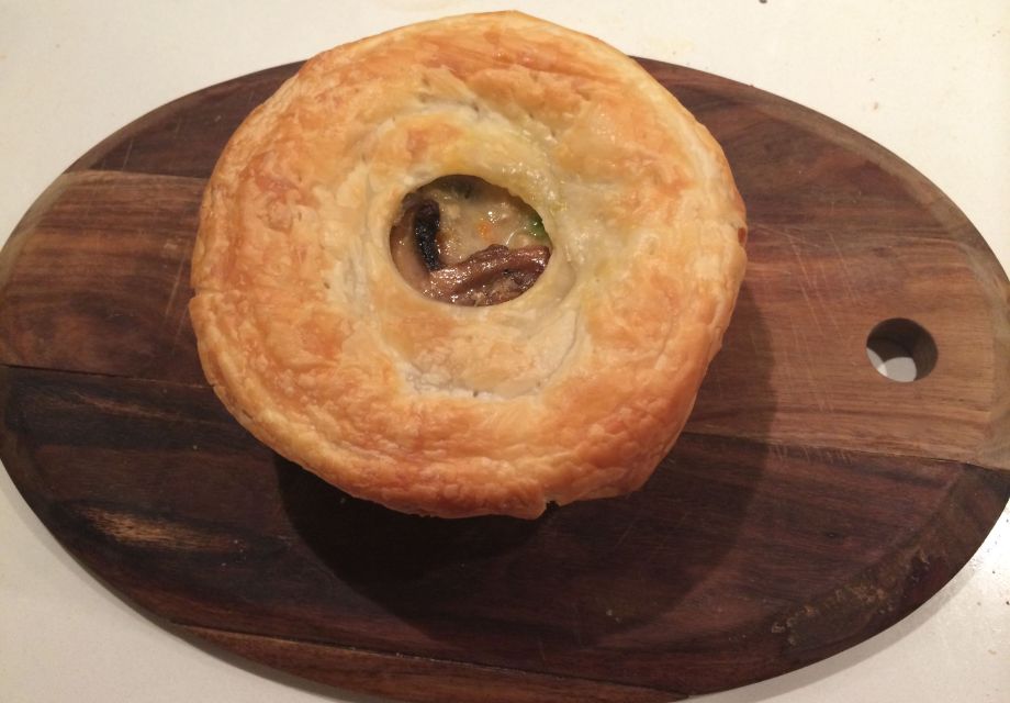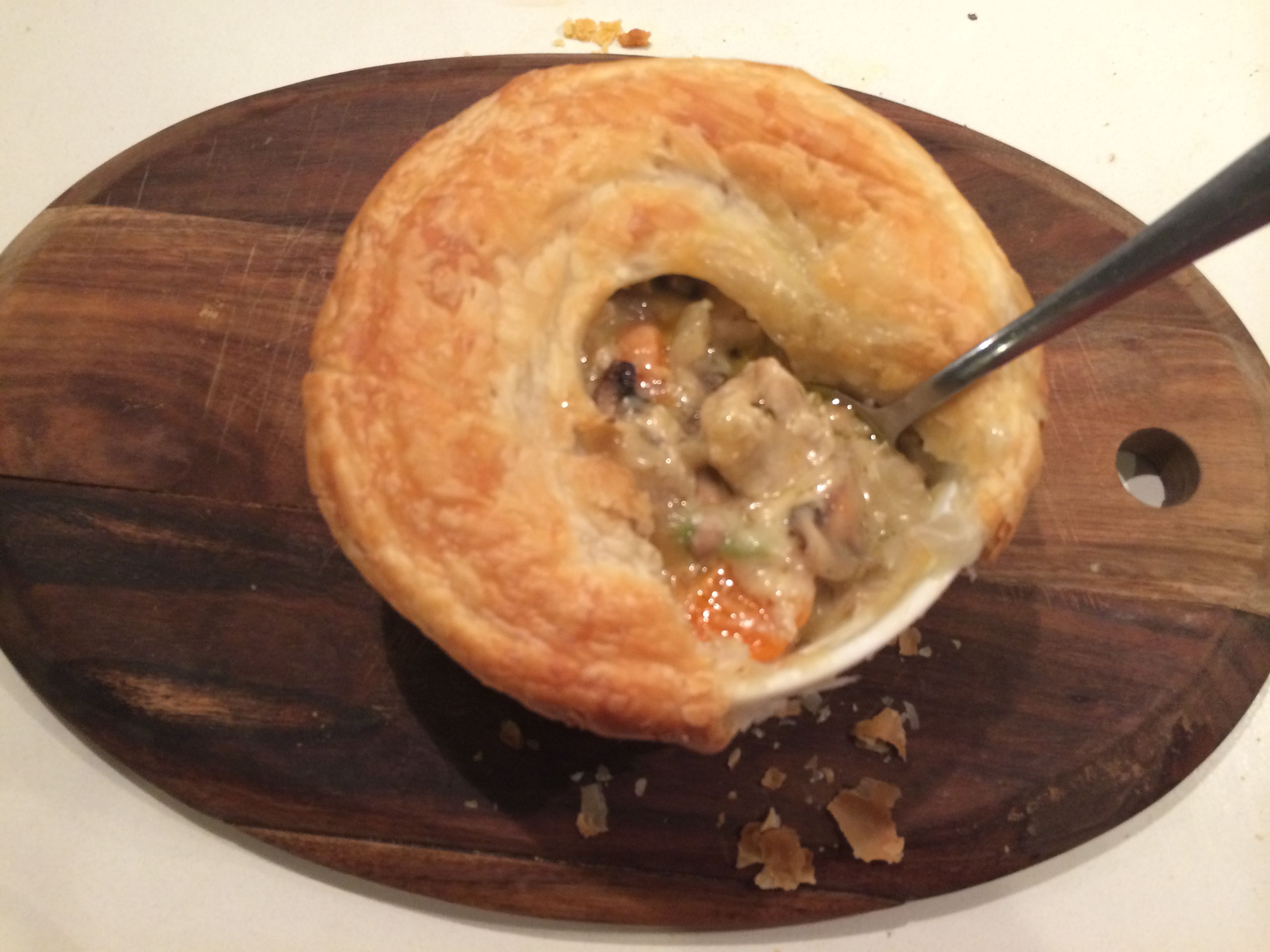 - Divide mixture evenly between four shallow baking dishes (or if you like, one large family sized baking dish). Cut puff pastry into circles large enough to cover your dishes (I like to cut a circle into the centre of the puff pastry at this point rather than a cutting a slit later, but this is up to you) and place on top of each of the bowls, crimping edges as desired. Cut a slit in the centre of each piece of puff pastry to allow steam to escape; brush beaten egg over puff pastry.